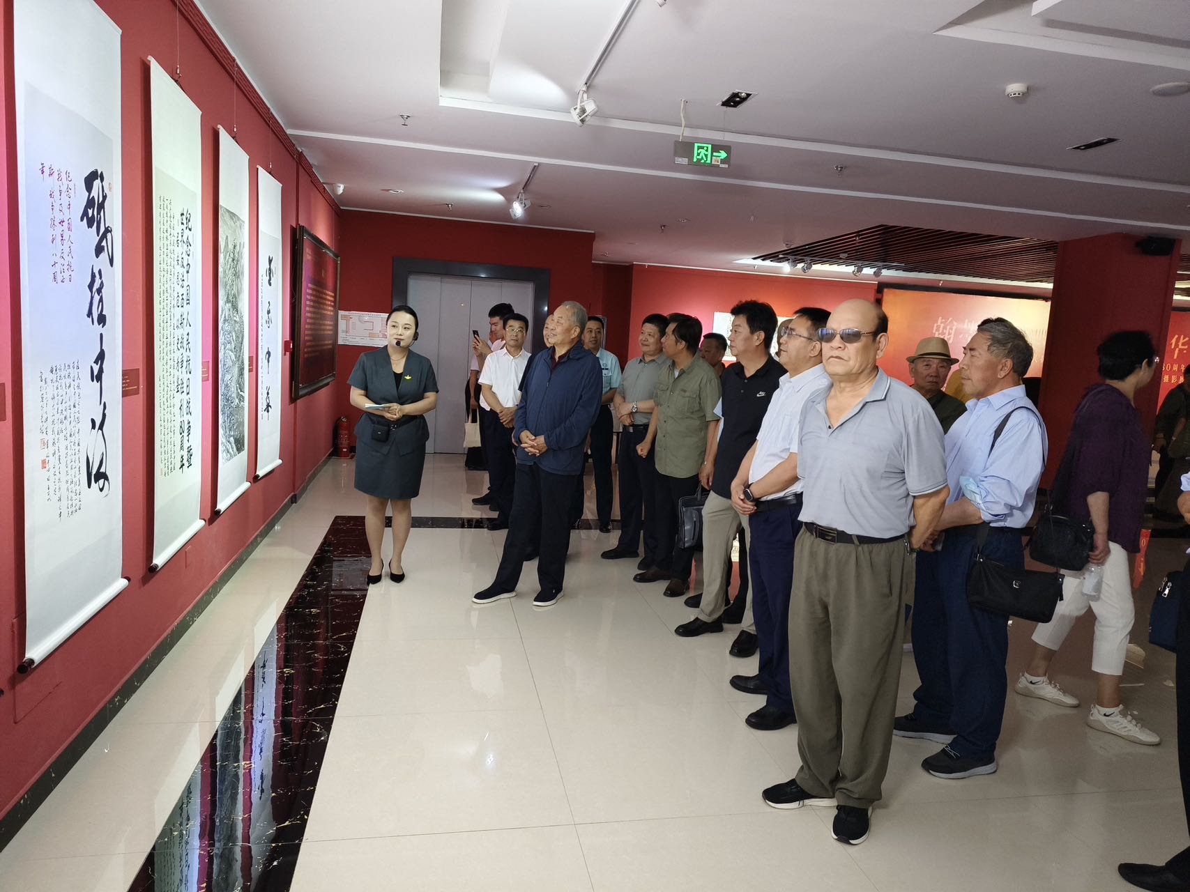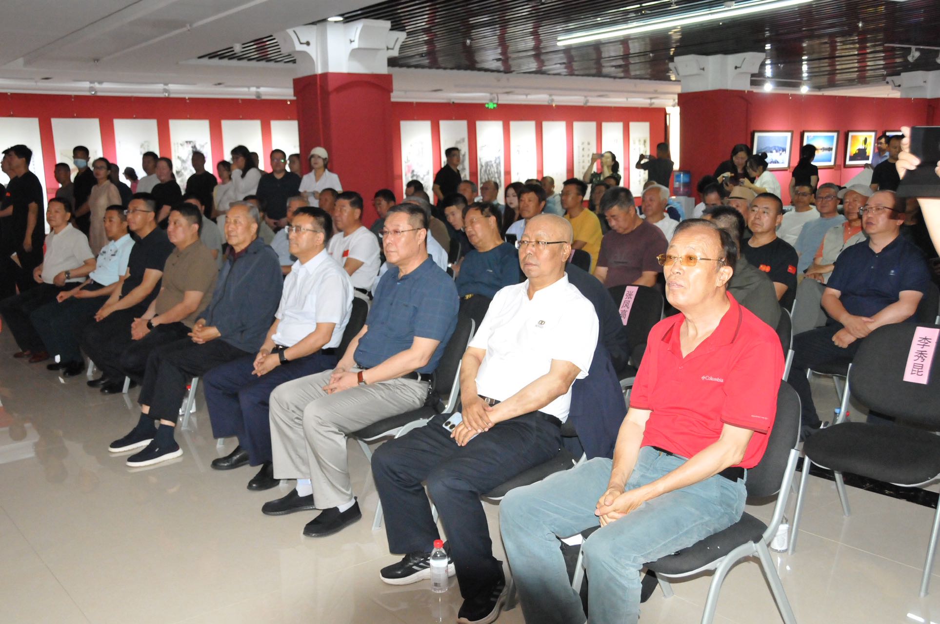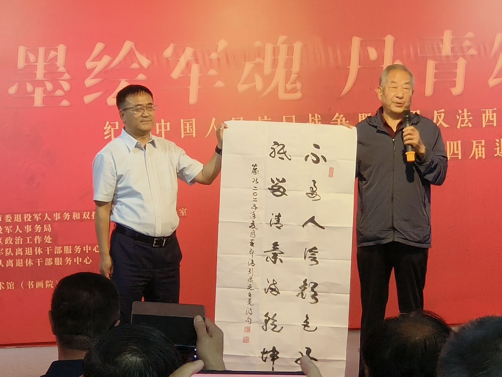 开幕式现场气氛热烈,众多嘉宾齐聚一堂。呼和浩特市退役军人事务局巴特尔副局长主持开幕式。内蒙古军区原副司令王印清少将出席,并向呼和浩特市退役军人事务局赠送亲笔书写“不要人夸颜色好,只留清气满乾坤”的墨宝。内蒙古自治区国防动员委员会原办公室主任张培亮大校,呼和浩特警备区原副政委田玉美大校,乌兰察布军分区原副司令李凤岭大校,乌海军分区原副政委张凤高大校,内蒙古军区原第四干休所所长姜连祥大校,优秀退役军人青城老兵宣讲团团长田华全、副团长赵宝平,优秀退役军人书法名家贾耀,优秀退役军人內蒙古文史馆二级巡视员、内蒙古青少年书画协会会长王雅秋,以及中国观网华北区总裁郭晓东,內蒙古国学研究会书画院院长李秀昆、北疆书院院长吴东威等参加开幕式并展出作品。开幕式上优秀退役军人书画家任万昌代表广大退役军人发言。