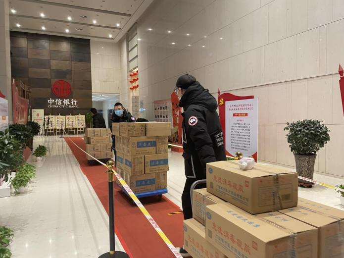 图为中信银行呼和浩特分行为客户赠送抗疫物资准备过程