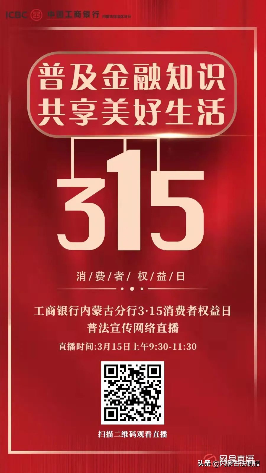 “普及金融知识 共享美好生活”----工商银行内蒙古分行3.15消费者权益日普法宣传网络直播即将开启!