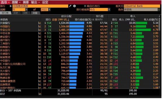根据彭博数据显示,2022年一季度兴业银行中资离岸债券承销量全市场排名位列第一。一季度,该行充分发挥香港分行连接境内外“桥头堡”作用,共承销境外项目57笔,承销金额15.35亿美元,服务超过50家企业,协助境内企业运用境外债券发行拓宽融资渠道,搭建海外平台及实现多元化资产配置。
