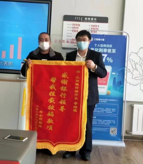 近期,一名客户来到工行包头稀土高新技术产业开发区支行营业室向大堂经理救助,自述被人从网上骗走了1万多块钱,大堂经理询问客户是否报警,客户表示已报警,但手机还不停的收到电信诈骗人员发来的验证码,大堂经理稳住客户情绪,告知客户先不要回复对方,并引导客户到智能机查询其账户情况,通过查询系统显示客户刚刚注册了一个工银e钱包,该行大堂经理马上呼叫网点负责人协助处理,网点负责人见状立刻采取措施,对该账户进行挂失处理,同时查询到该e钱包绑定的是客户的一个农行账户,随即帮助客户进行了解绑处理。后续该行查询客户账户信息显示虚拟账户内资金还在卡中,并未被转走,客户激动的喜极而泣,并深深的表达了对该行工作人员的感谢。次日,客户制作了一面锦旗送到工行包头稀土开发区支行,再次对工行为其拦截了被骗资金表示感谢。