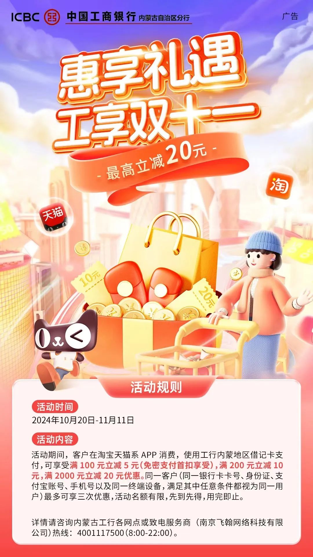 工商银行内蒙古分行:工享双十一,淘宝天猫最高立减20元!
