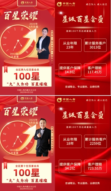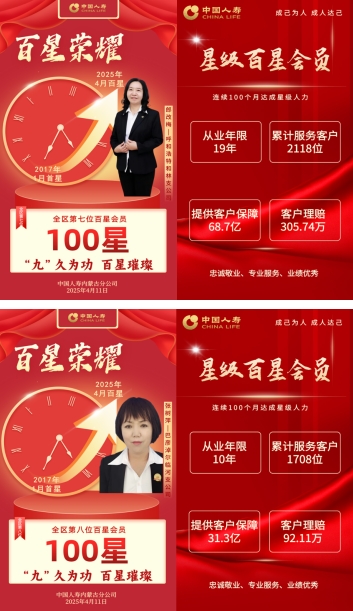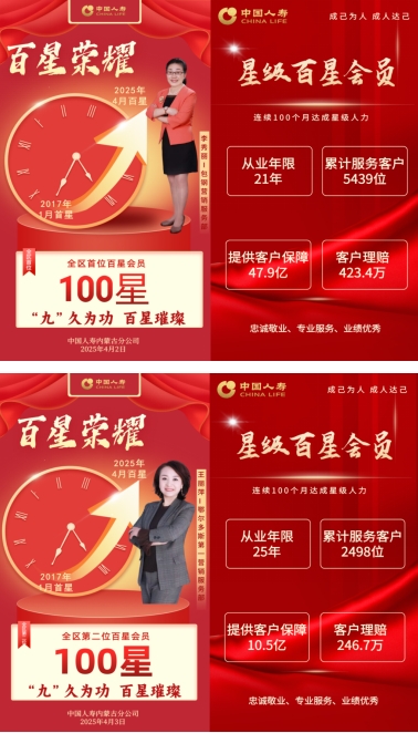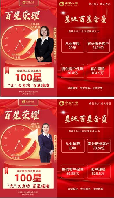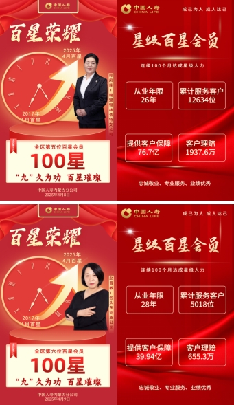 中国人寿以遍布全国的服务网络,用责任守护万家灯火,中国人寿始终用贴心回应需求,以用心兑现承诺,让每一份托付都化为安心的保障与温暖的相伴。中国人寿内蒙古分公司在2025年将有22位全国首批百星会员荣耀诞生,其中10位在4月份率先加冕。 他们以“成己为人”为信念,以“成人达己”为担当,是“五心五行”文化的践行者,更是保险为民、服务报国的时代先锋!