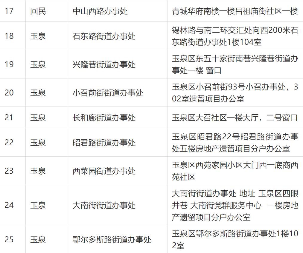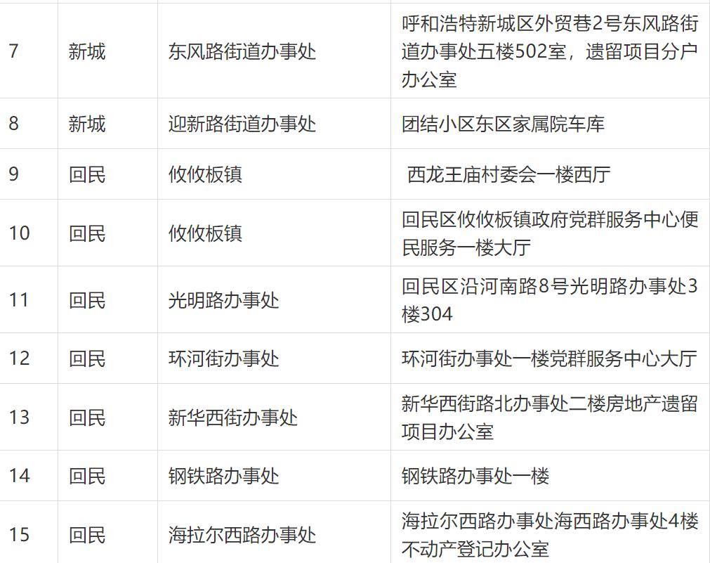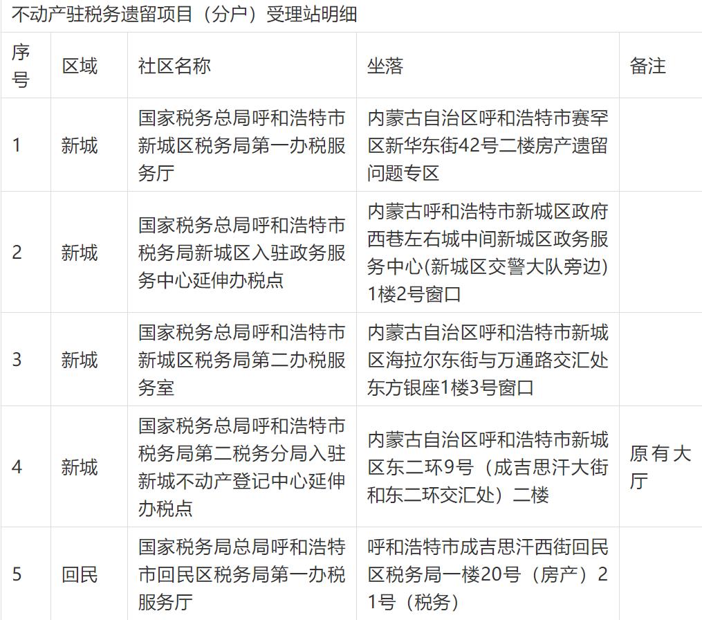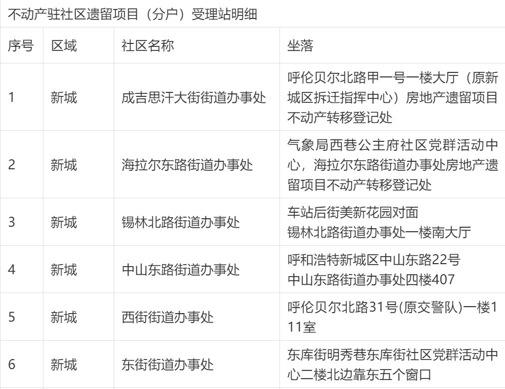 按照市委市政府加快推进房地产遗留项目转移登记(分户)工作的安排部署,根据《呼和浩特市房地产遗留项目不动产转移登记(分户)实施方案》的要求,呼和浩特市四区及经济开发区在街道办事处分别设立40个不动产驻社区遗留项目(分户)受理站,呼和浩特市税务局设立20个不动产驻税务遗留项目(分户)受理站(包括市四区不动产登记服务大厅原有的5个受理点),深入一线为民办事,方便百姓就近在社区提交申请材料并缴税,早日拿到证书。