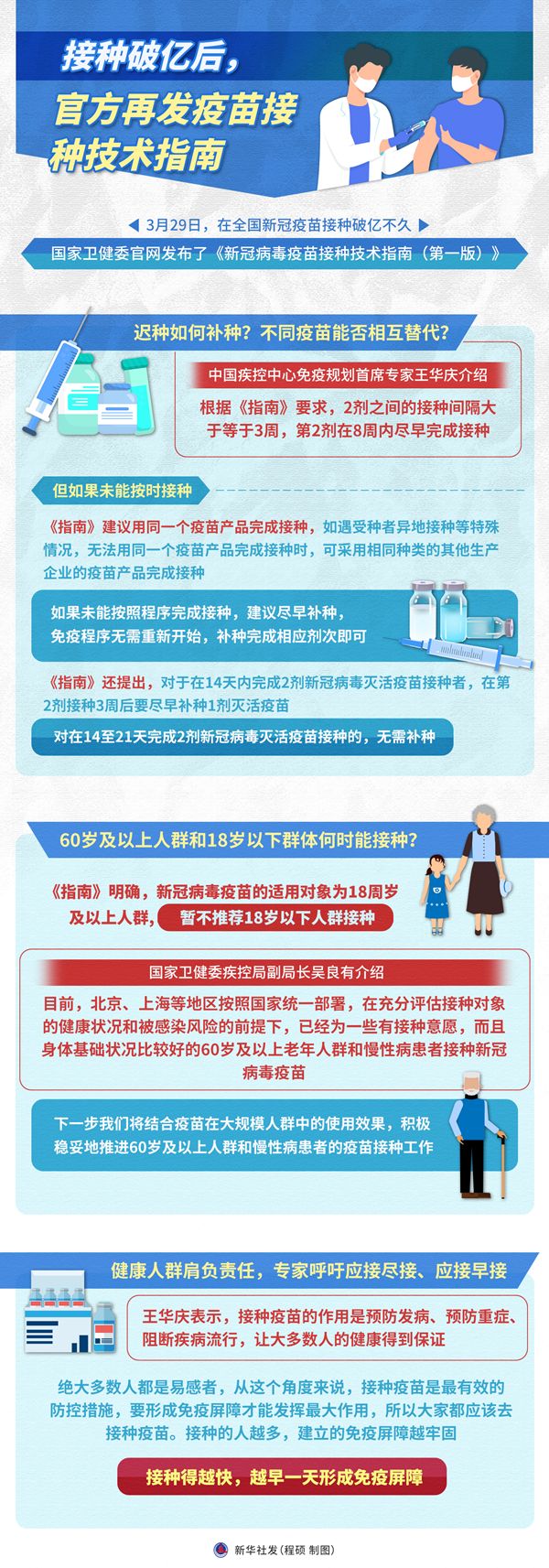 早在今年1月7日,国家卫健委、中国疾控中心就曾联合发布《新冠病毒疫苗接种问答》之“30问”。此次再发技术指南,增补了最新研究实践总结,特别是明确了迟种如何补种、能否与其他疫苗同时接种、不同疫苗产品能否替换、有哪些接种禁忌等问题,并专门对60岁及以上人群、18岁以下人群、慢性病人群、育龄期和哺乳期女性、免疫功能受损人群和既往新冠患者或感染者给出接种建议。