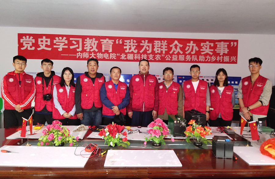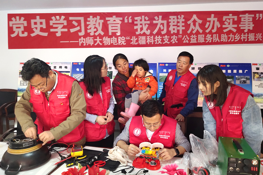 党史学习教育开展以来,内师大物理与电子信息学院党委紧紧围绕“学党史、悟思想、办实事、开新局”,坚持把党史学习教育与为民办实事结合起来,以庆祝建党100周年为契机,积极开展“我为群众办实事”实践活动。6月8日,内师大物电院组织科技技术专家和“北疆科技支农”公益服务队,深入乌兰察布市察右后旗锡勒乡红旗庙嘎查开展“科技下乡,助力乡村振兴”我为群众办实事实践活动,受到了当地村民们的热烈欢迎。