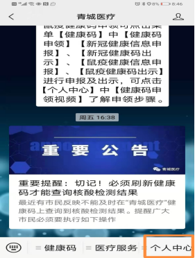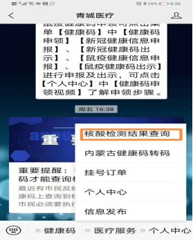 2月20日,记者从呼和浩特市卫健委了解到,按照自治区统一要求,健康码上不再显示核酸检测结果,现已转到“青城医疗”微信公众号“个人中心”进行查询,请周知。