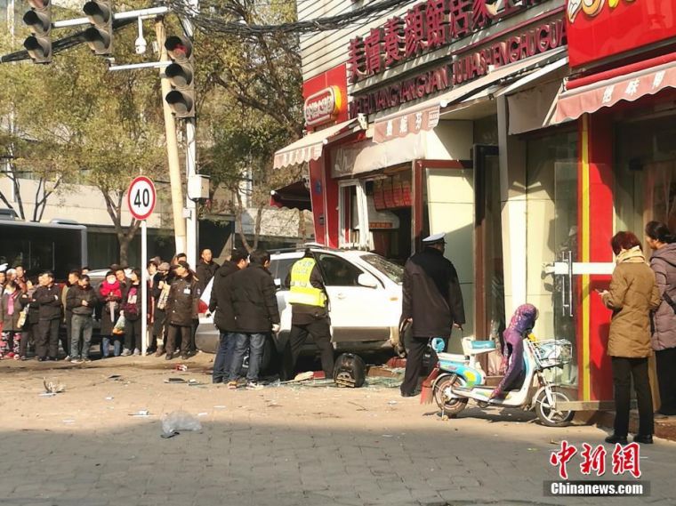 12月14日上午10时左右,在郑州市中原区淮河路与工人路交叉口发生一起交通事故。一辆白色SUV轿车在撞上一辆电动自行车后冲入沿街一包子店,事故造成1人死亡,8人受伤。据郑州市交巡警二大队通报,目前,59岁的肇事司机陈某已被警方控制,伤者送医救治,事故正在进一步调查。图为交警在事发地点处理事故。韩章云 摄