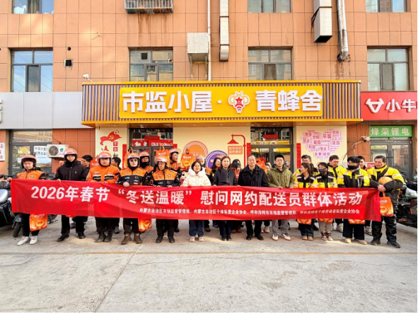 2 月 9 日下午,自治区市场监督管理局联合自治区个体私营企业协会、呼和浩特市市场监督管理局及呼和浩特市个体私营企业协会,走进呼和浩特市“市监小屋・青蜂舍”,共同开展“冬送温暖”网约配送员慰问活动,为奔波一线的骑手们送上节日祝福与关怀。