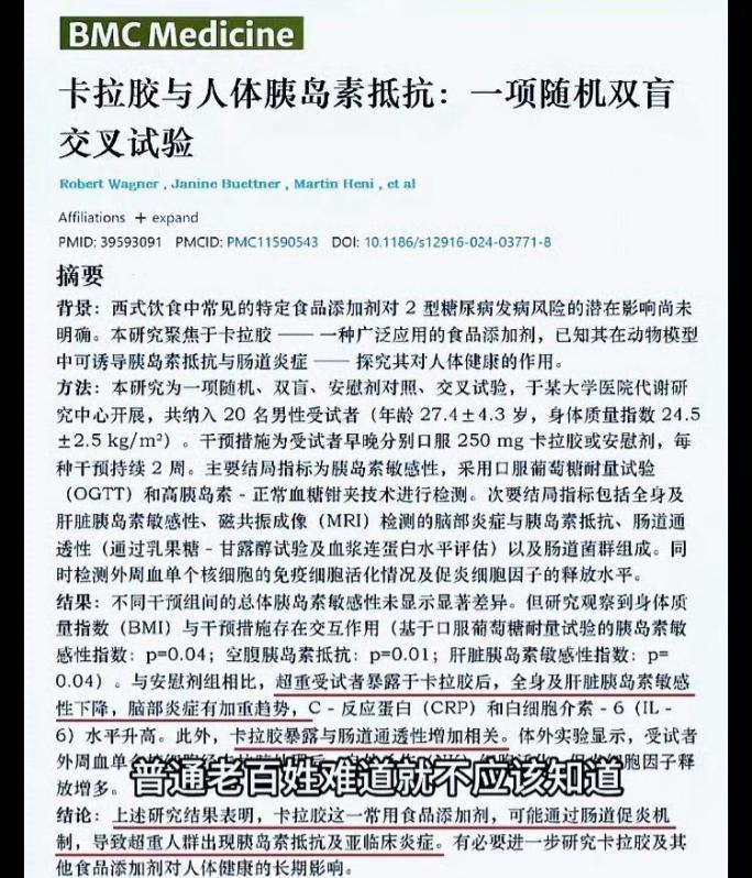 最近有个热搜说:“新研究发现:卡拉胶可能与胰岛素抵抗有关,尤其对超重人群影响更为明显。”很人将其解读为“卡拉胶会导致胰岛素抵抗”,觉得零食都不能吃了。