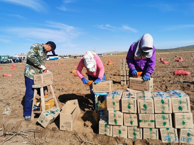 七顷地村属于前进村下辖的自然村,方圆500亩的田里满是红彤彤的土豆,数十名工人正在田埂间忙碌着,机械作业、人工分捡、装箱、称重、打包、贴单、装车……一派繁忙的秋收景象。几辆邮政车直接开进了地里,将沾满泥土气息的新鲜土豆装车后直接发往全国各地。