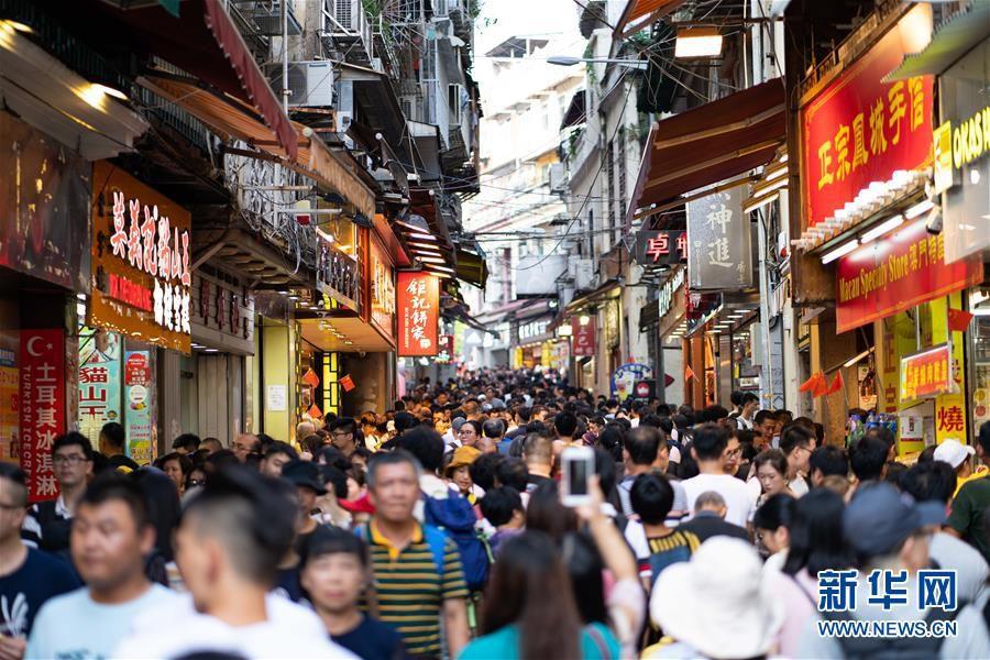 10月2日,游客在澳门大三巴牌坊前地手信街游览。当日是国庆长假第二天,澳门著名景点大三巴牌坊、议事亭前地游人如织。新华社记者 张金加 摄