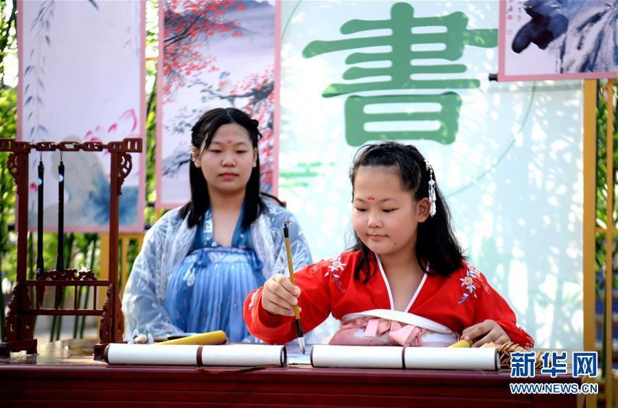 10月3日,在河北邯郸市磁县方特主题公园内,游客在练习书法。 当日是国庆假期第三天,人们纷纷走出家门,乐享假期。 新华社记者 王晓 摄