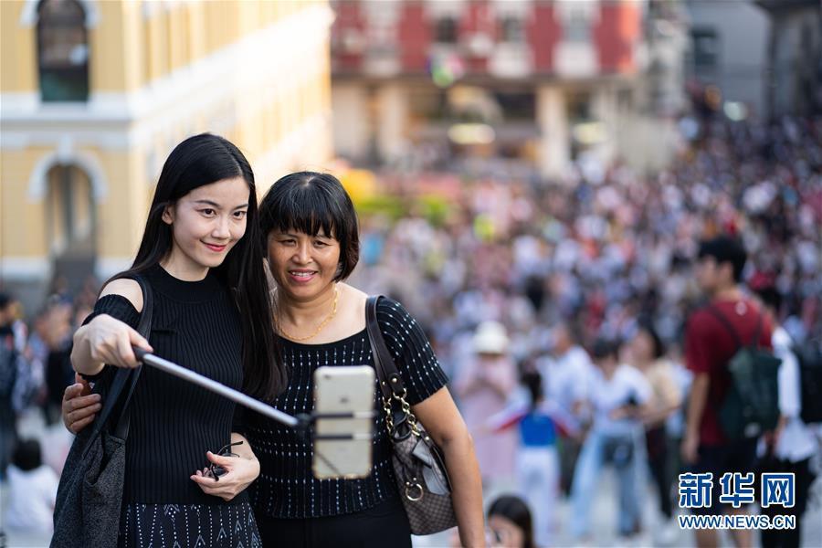 10月2日,游客在澳门大三巴牌坊前地自拍。新华社记者 张金加 摄
