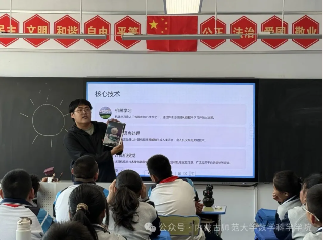 在和林格尔县乳业开发区第一小学,内蒙古科学技术普及学会兼职副秘书长、内蒙古师范大学数学科学学院博士研究生乌日乐等一群研究生科普志愿者,他们用所学的“数据科学与智能信息处理”“基础数学”“应用数学”等学科专业,用通俗易懂的语言,为小学生普及“人工智能是什么”“人工智能会做什么”“机器是怎样看懂图像的”,通过活动让学生积极体验,在活动中感知科技、思考未来、收获新知。参加科普活动后,同学们对人工智能技术的认知从“遥远的科技名词”转变为“融入生活的实用工具”,既惊叹于技术的飞速发展,也对其未来应用有了更清晰的思考。